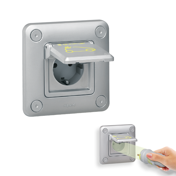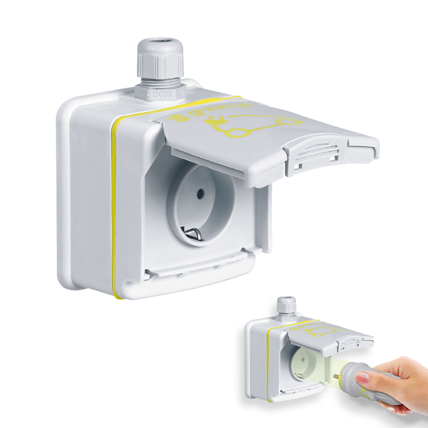 • Verstärkte, Steckdose, Robust und Wassergeschützt IP 55 (mit geschlossenem Deckel) . Entwickelt für aufladbare Elektro- und Hybridfahrzeuge